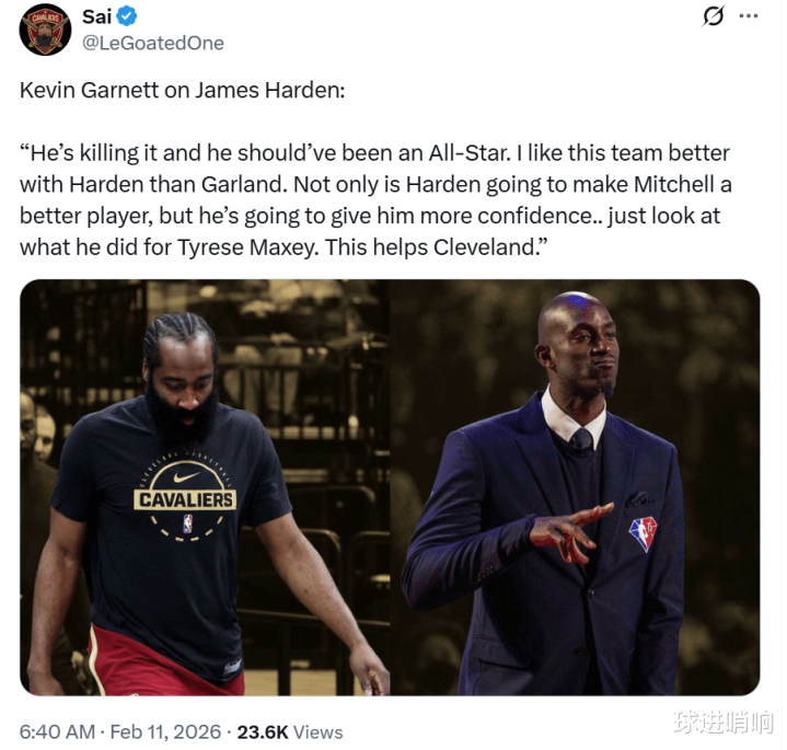 NBA名宿加内特也持有相同观点,认为哈登无论是在快船的表现,还是加盟骑士后对于米切尔的帮助,都让其有资格入选全明星。