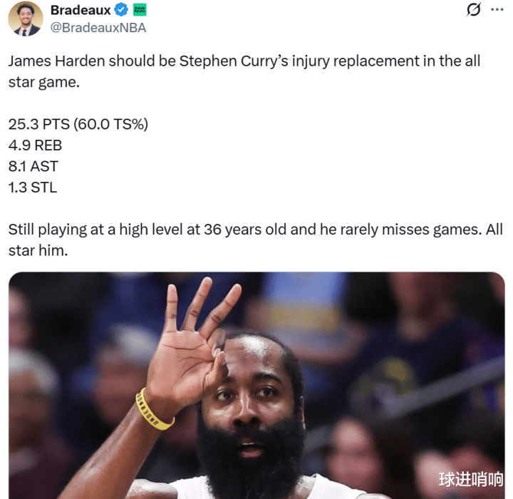 在库里确认伤缺之后,哈登是社媒球迷热议的递补人选之一,他与湖人里夫斯的呼声甚至要超过英格拉姆。