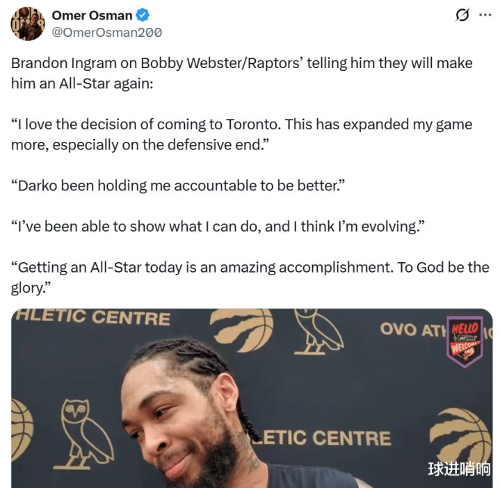 对此英格拉姆本人自然也十分开心,接受采访时笑着说道:“我对加盟多伦多的决定感到满意,这极大得提升了我的比赛水平,尤其是在防守端,拉贾科维奇一直在督促我变得更好,我在这里有足够的空间展示能力,并且认为自己正在不断进步,能够入选全明星阵容是一项了不起的成就,一切荣耀归于上帝。”